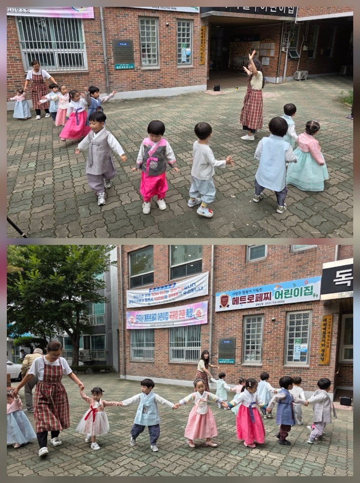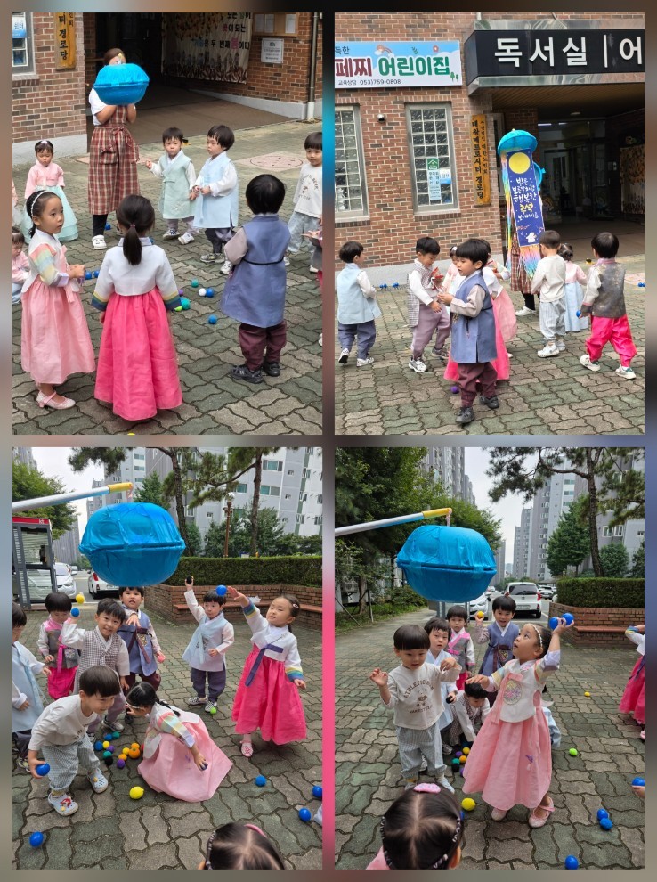 오늘 어린이집에서는 풍농을 기원하며 강강술래 ,박 터트리기 놀이를 했어요.
