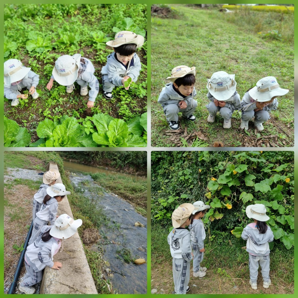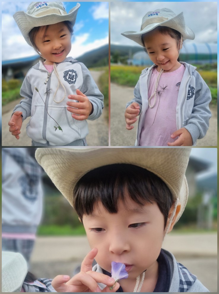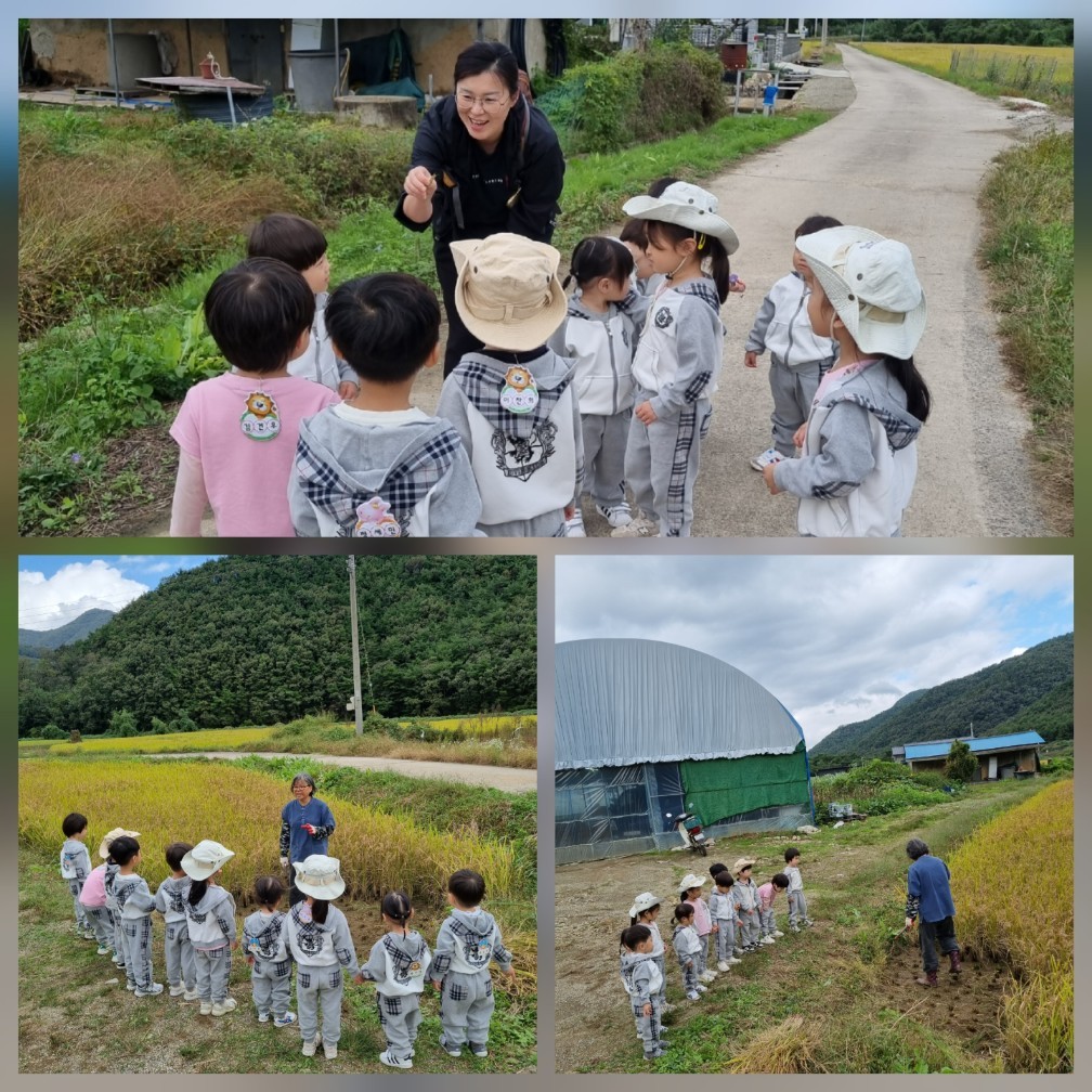 신나게 가을 노래가 버스 안에 가득 했어요. 가을은 가을은 노란색~~가을 동요를 부르며 초록산이 알록달록 색으로 물들어가는 풍경을 보며 매곡리 가는 길은 언제나 신이 나 있는 우리 친구들이에요. 매곡리 가을은 어떻게 변하고 있지?? 매곡리 산책을 했어요. 가을 들판은 노랗게 물들고 메뚜기는 풀숲에서 뛰어다니고 예쁜 들꽃들이 여기저기 피어 있었어요.