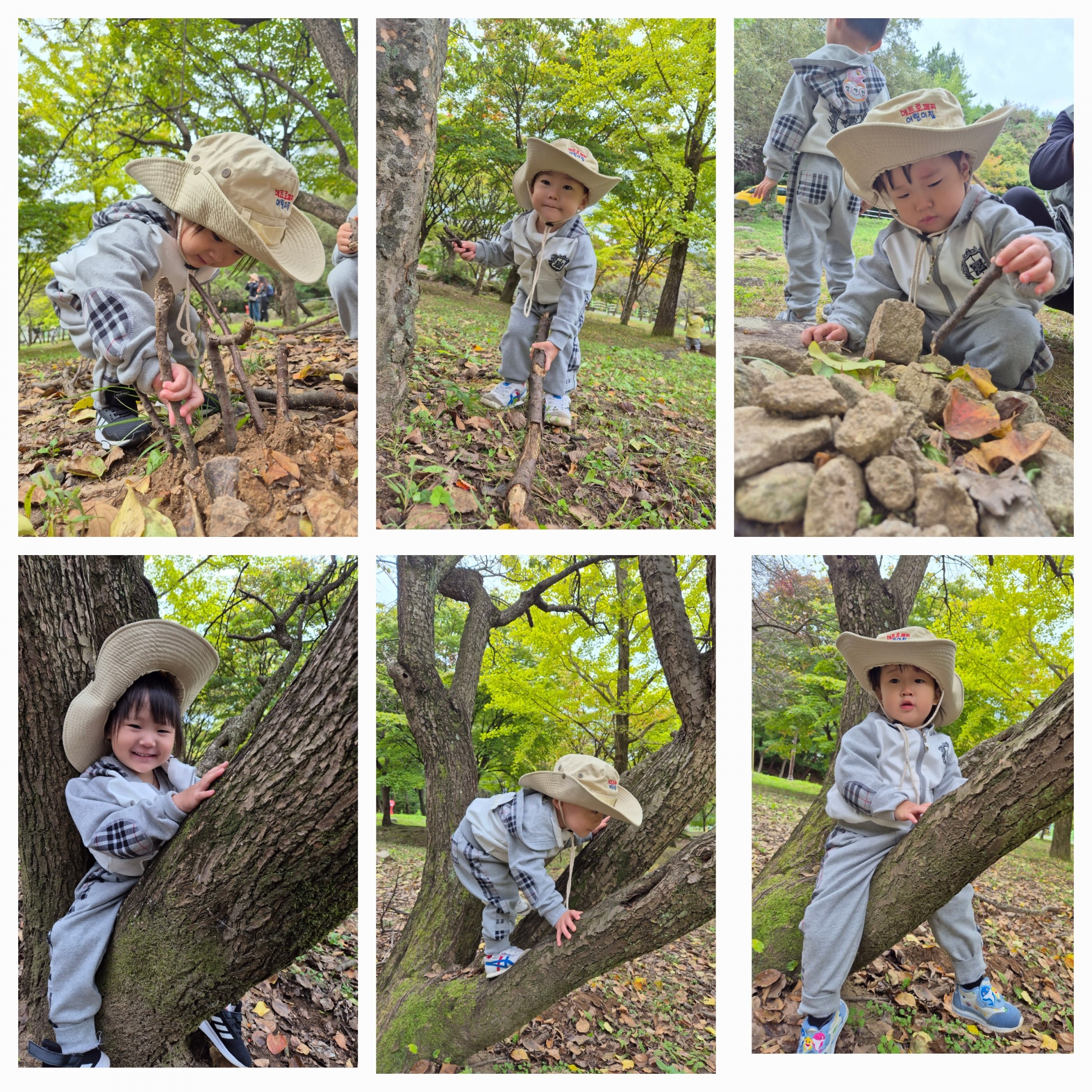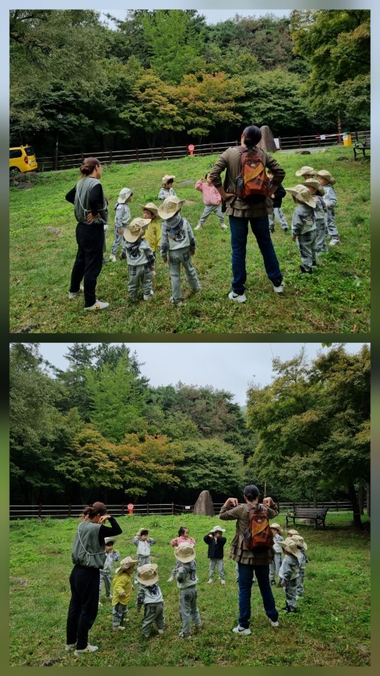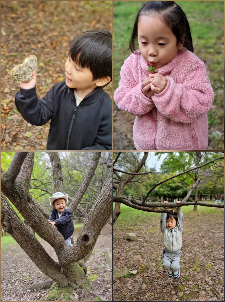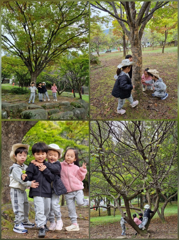 바위 위에서 ‘하나, 둘, 셋!’ 뛰어내리기 놀이를 하기도 하고, 나무를 타기도하고 나무에 올라 코알라처럼 꼭 매달리기도 하며 상상 놀이를 펼쳤답니다🌳🐨