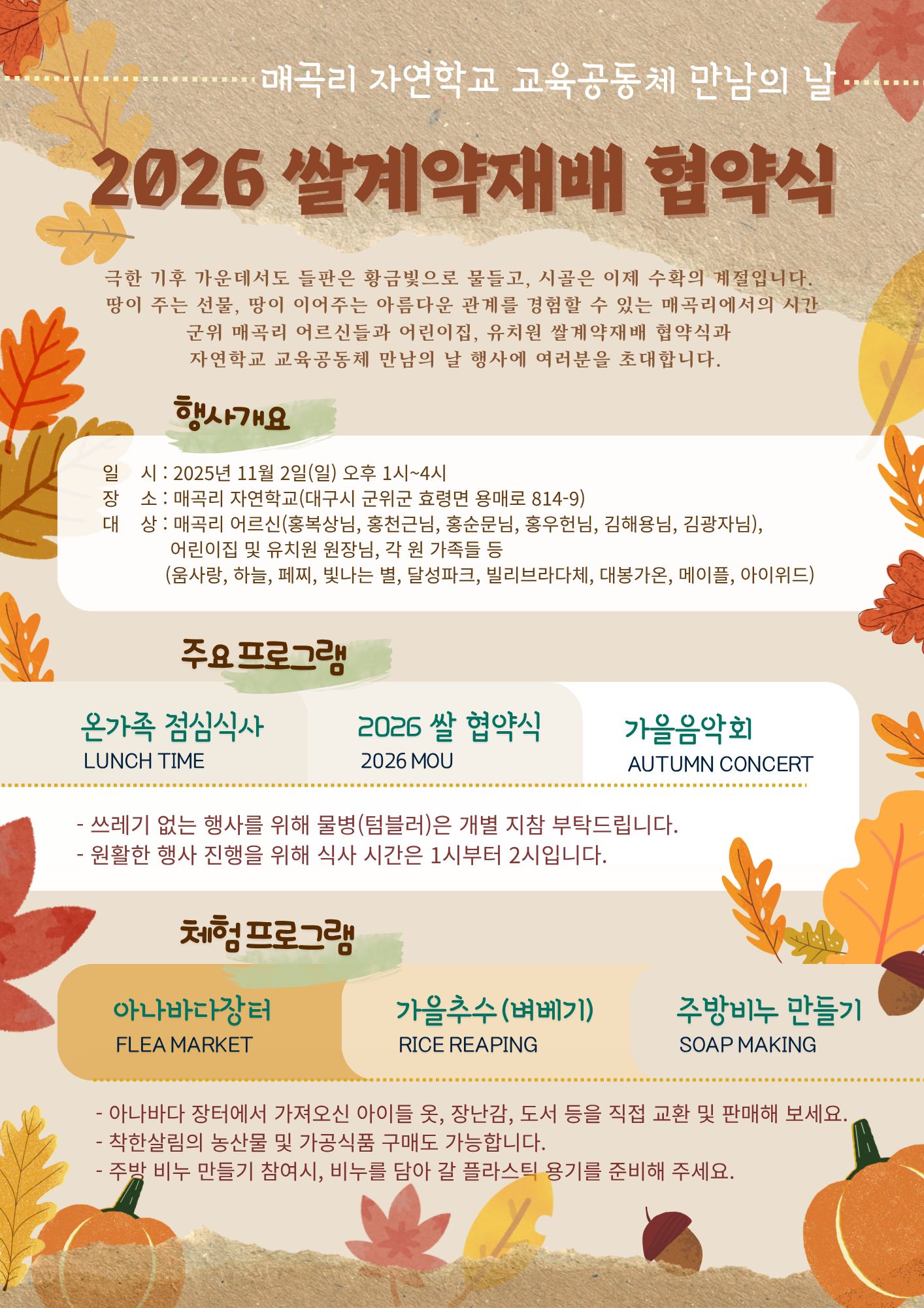 📣 매곡리 자연학교 쌀 재배 계약 협약식 초대장이 나왔습니다.