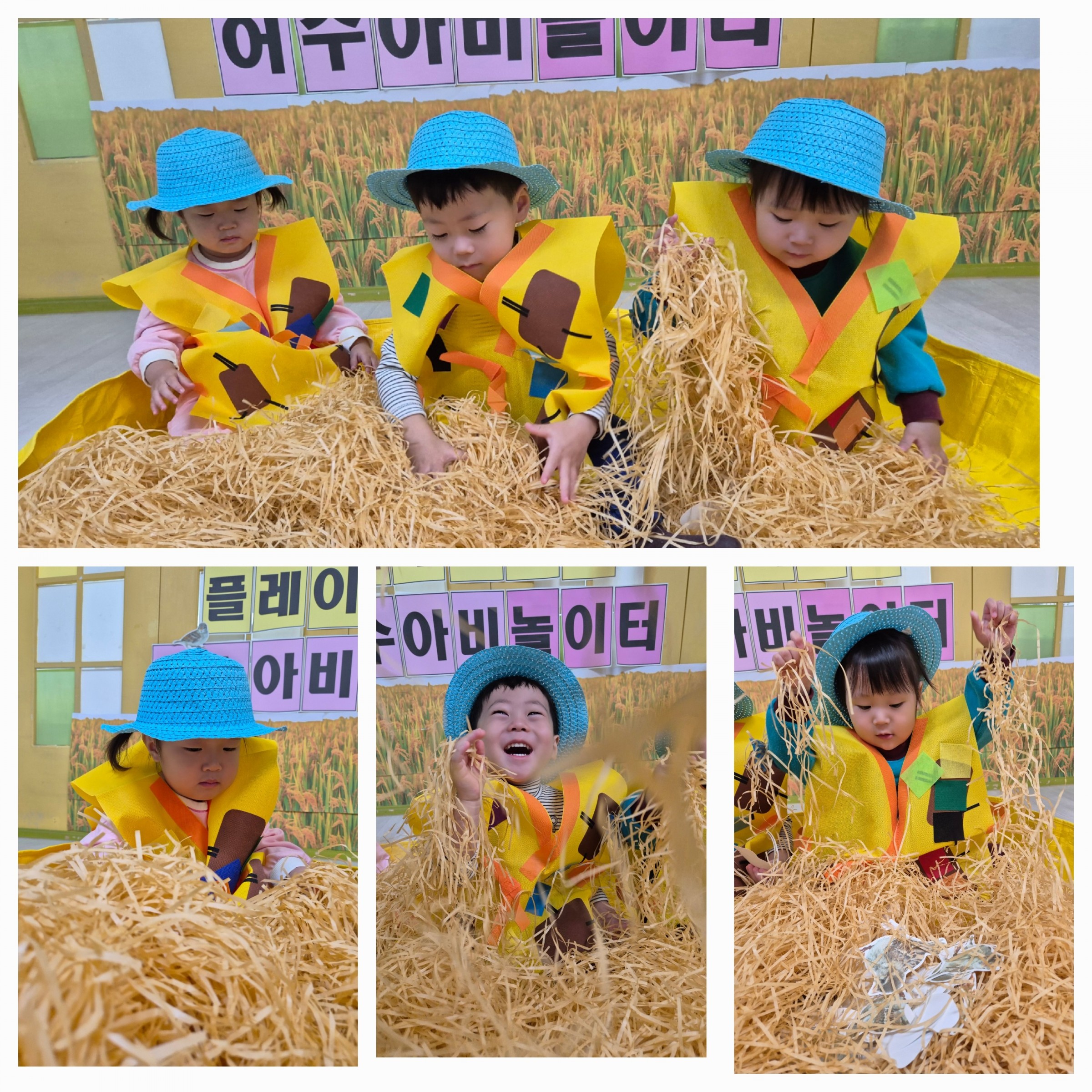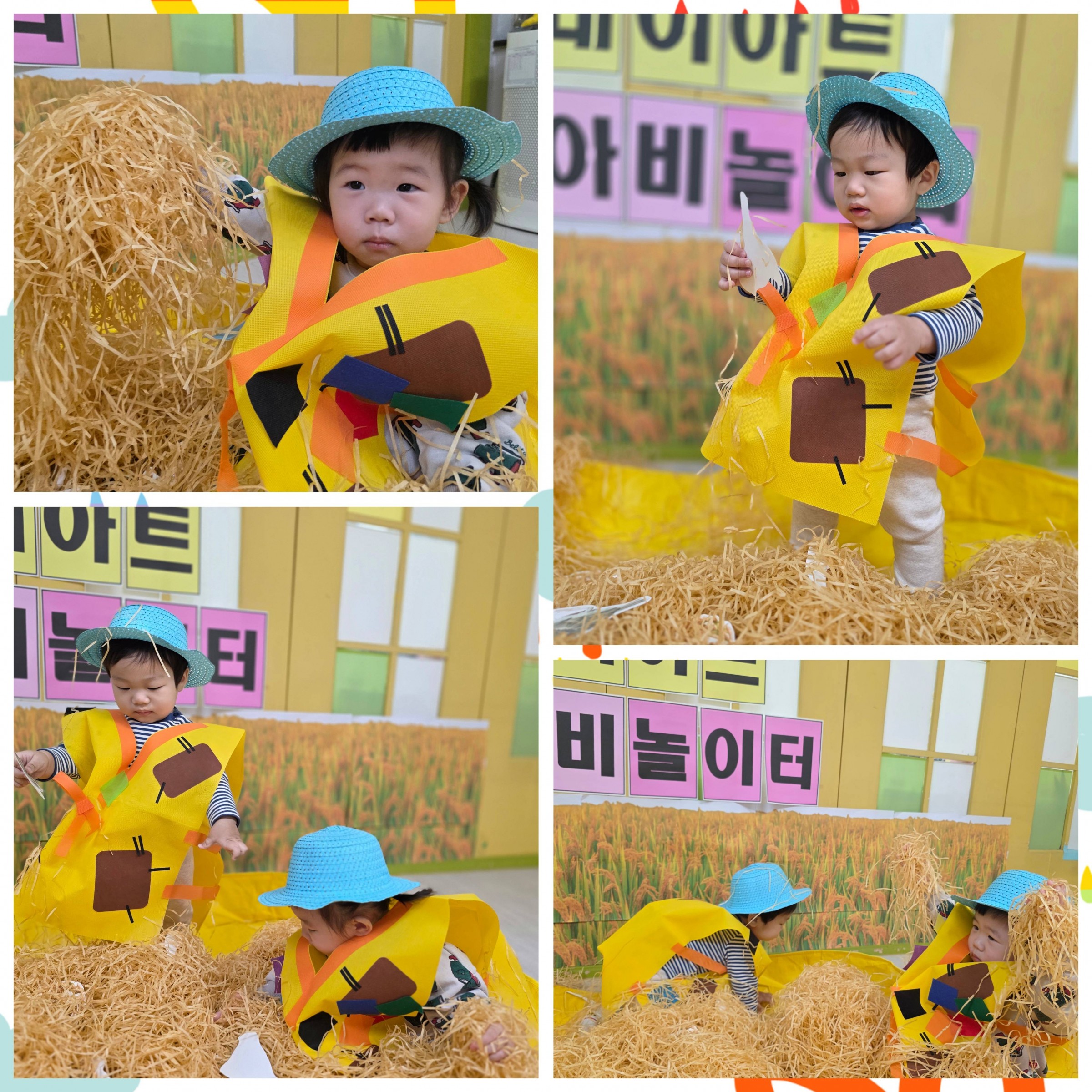 허수아비가 되어 라피아 스타핑속에 있는 숨어있는 참새와 벼 찾기 놀이를 했어요.