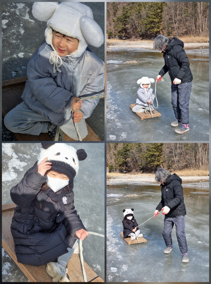 생각하며 "매곡리 강에 내려가서 썰매 탈 수 있을까요?" 여쭈었더니 "다라이(?ㅎㅎ)도 있고 혼자타는 썰매도 있고 , 끄는 썰매도 있고 타러가자~~" 라고 말씀해 주셨어요.