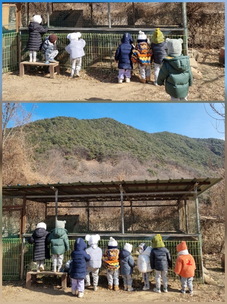 썰매를 타고 토끼랑 닭이 춥지 않을까? 배고프지 않을까 ? 잘 있는지 보러 갔어요.