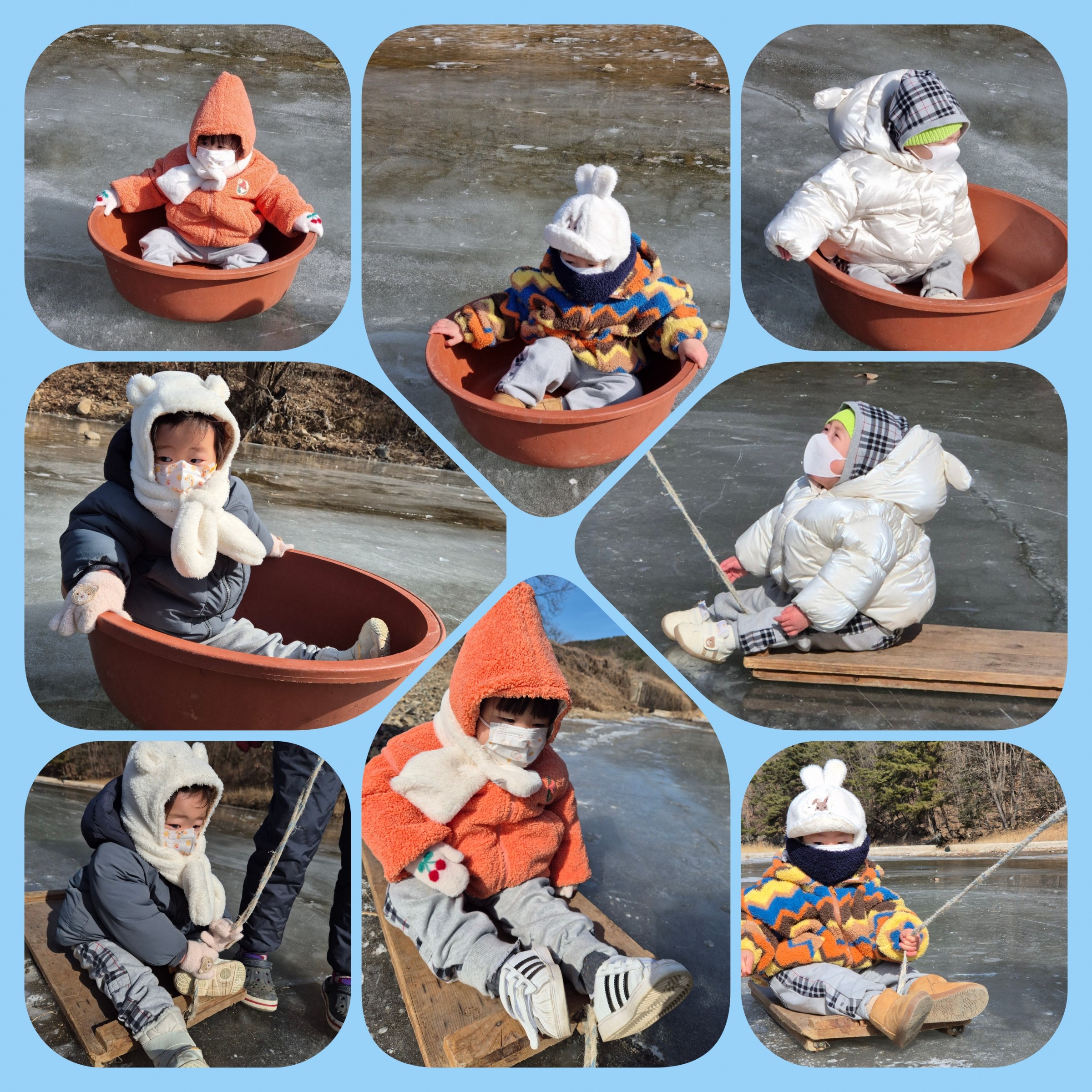 선생님들이 (야호 !! 얼음이 얼었다고 ~~ 그럼 우리 페찌 친구들 썰매 놀이 할 수 있을까?)