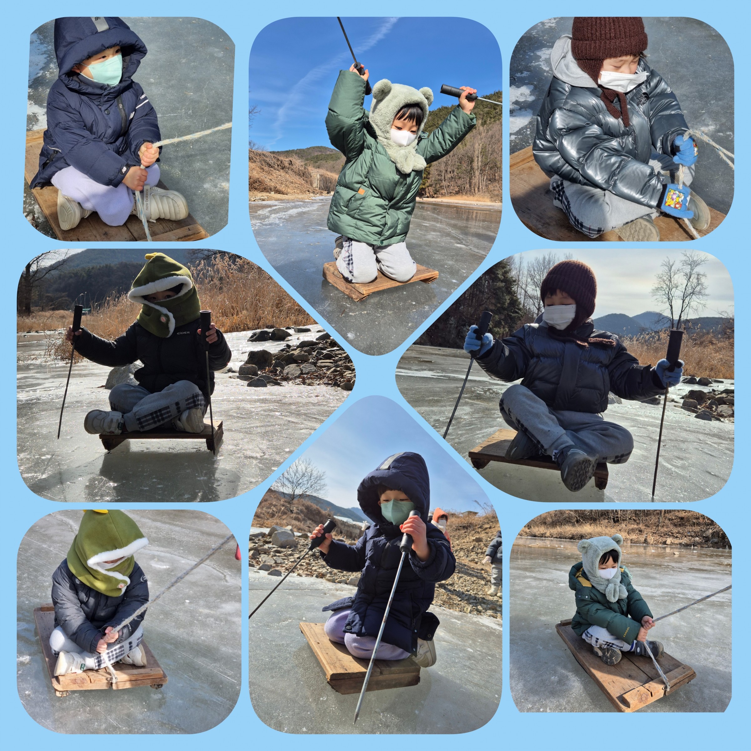 흐르는 매곡리 강 만 보았는데 매곡리 강에서 얼음 썰매를 탄다고 생각하니 우리 친구들도 선생님들도 너무 신이 났어요.