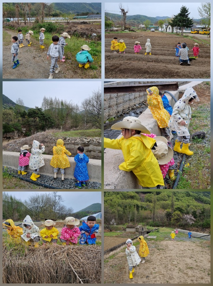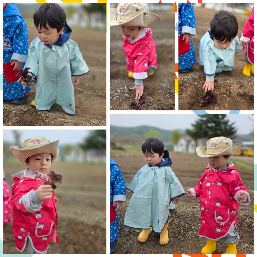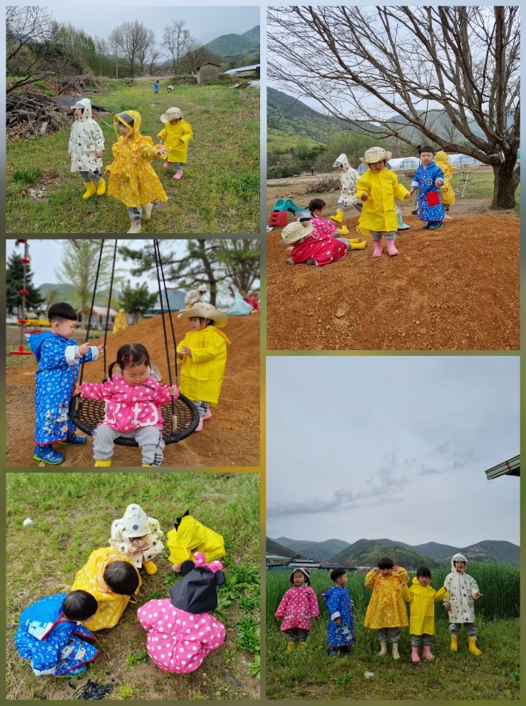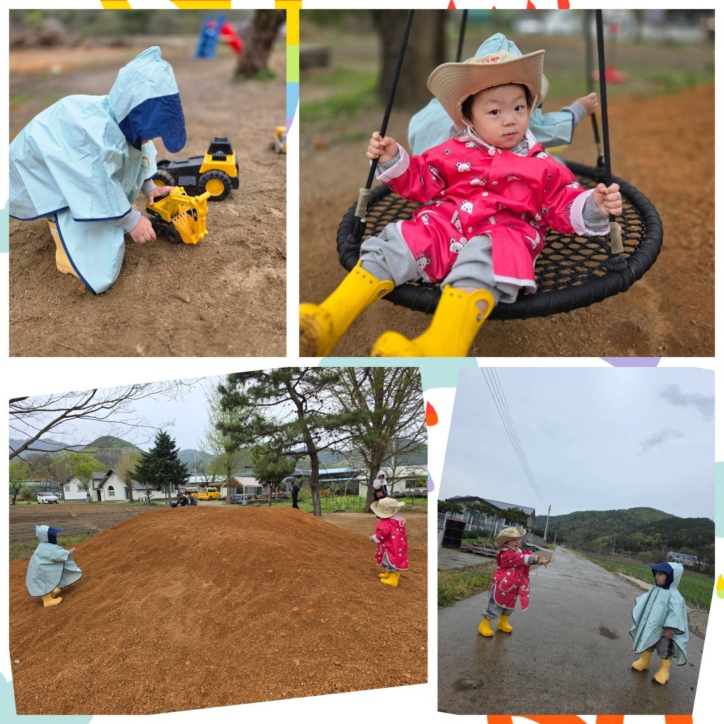 비가 오는 상황에서도 비옷을 입고 활동을 하며 환경에 적응하며 신나게 놀았어요.